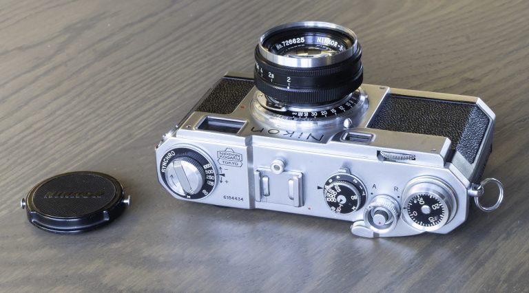 The first Nikon S was identical to the Nikon M but with flash contacts and came out in 1950. The S2 of 1954 was a considerable improvement with a larger viewfinder (100% view), a higher 1/1000th top shutter speed and lever-wind film advancement. My black dial is a later version produced from 1957 to 1958 when the S2 was superseded by the SP which had frame lines for additional lenses. The 1959 Nikon F SLR shared much of its body with these rangefinder cameras which were soon discontinued with its introduction..