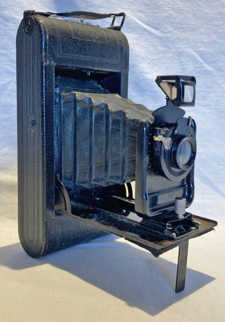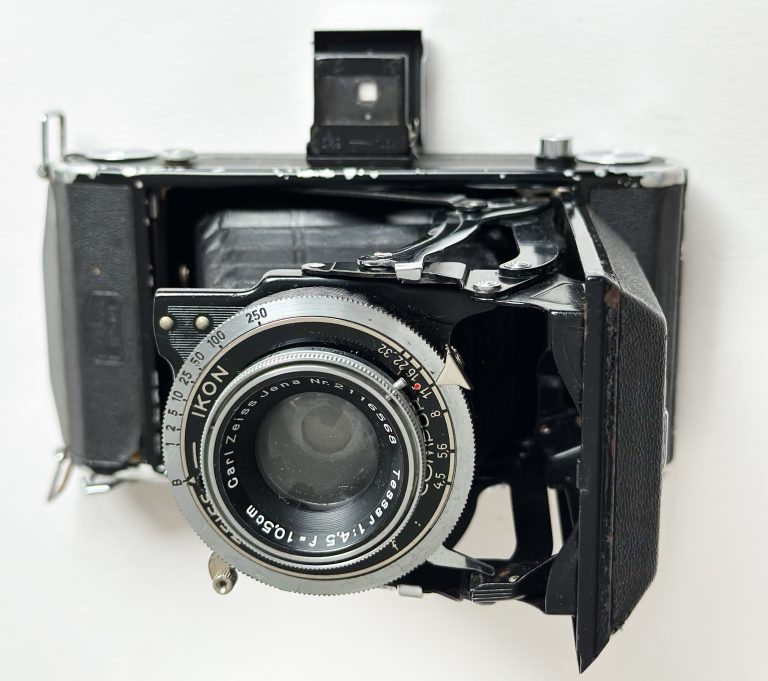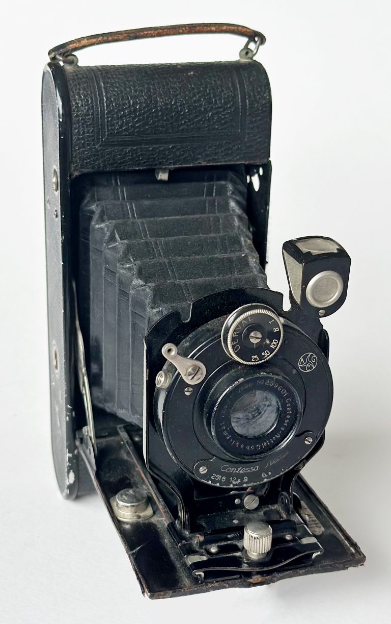 According to Camera-Wiki “The Cocarette was a non-self erecting folding camera for rollfilm. It was one of the first new products of the German camera maker Contessa-Nettel after the merger that led to the foundation of that company in 1919. The Cocarette camera series was continued after Contessa-Nettel itself was merged into the Zeiss Ikon group. Like many other folding camera types of the 1920s it was available in a variety of configurations. After the formation of Zeiss Ikon the Cocarette was given the model number ‘519’, with variations 519/14, 519/2, 519/15, denoting the film format. There was also a postcard format 522/17. Focusing was by a lever on the folding bed shifting the lens assembly forward or backward. Advanced versions were made which allowed vertical lens movements. The cameras all had a brilliant viewfinder, some incorporating spirit levels; some models also feature a wire frame sportsfinder. The original Contessa-Nettel design tried to simplify film loading with an insert that slides into the camera. This loading mechanism also meant a circular door in the back of the camera was provided to allow access to the lens for cleaning or removal. Production must have ceased c.1930 as the Cocarette does not appear in Zeiss Ikon’s 1931 catalogue”
