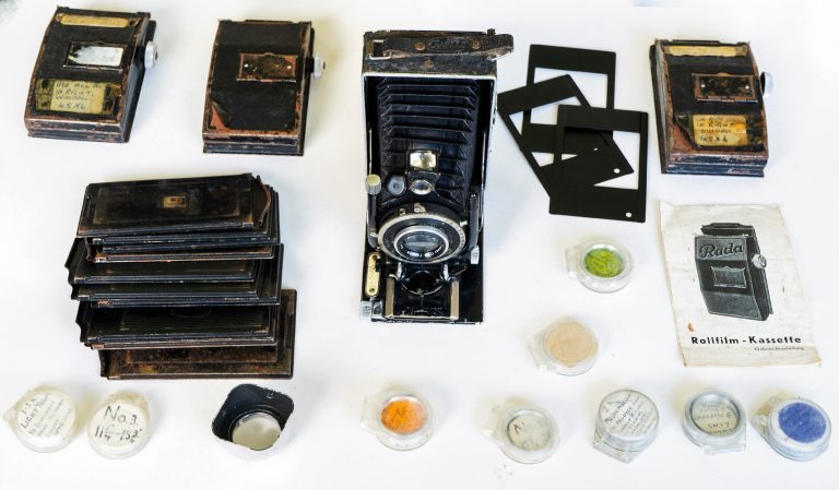 This 6.5 x 9cm camera is one of a series of folding plate cameras made by Voigtlander from 1913 to 1934. These cameras came in both 6.5x9cm and 9x12cm versions. They have double extension bellows and are equipped with Ibsor or Compur shutters, this example has a Compur with speeds from 1 to 1/250th. Also a Jena Tessar 120mm F4.5 lens is fitted. There is a small amount of both rise/fall and lateral shift movement. With my camera are a number of very rare Rada “Rollfilm-Kassettes”.