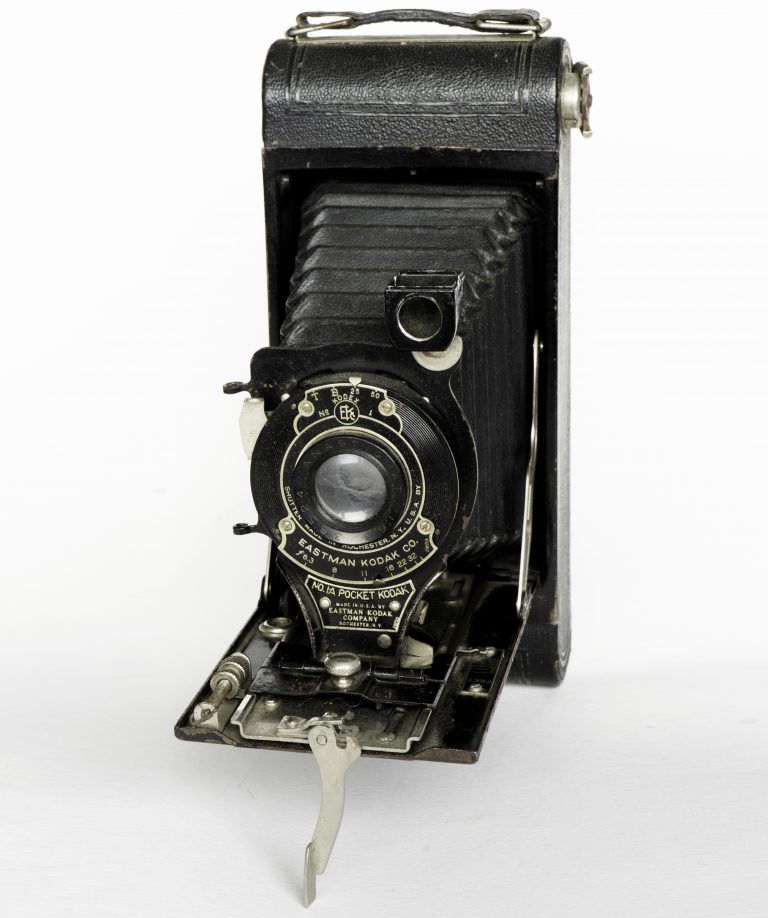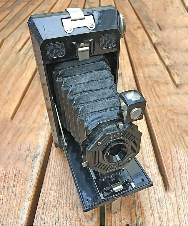 Another British made Kodak. According to Historic Camera “The No. 1A Pocket Kodak was manufactured from 1926 to 1932. This camera took twelve exposures, 2 1/2 x 4 1/4 inch size, on no. A 116 film without reloading. There were various lenses available for this camera including : -Meniscus Achromatic lens and Kodex shutter, speeds 1/25 to 1/50 second ($11.00) -Kodar f7.9 lens and Kodex shutter, speeds 1/25 to 1/50 second ($14.00) -Kodak Anastigmat f6.3 lens and a Kodak Diomatic shutter, speeds up to 1/100 second ($19.00) Constructed with a strong aluminum body and covered with a durable material. The metal parts were finished in nickel or black enamel. Features included a black bellows, autographic feature, worm screw focusing device, focusing scale, reversible brilliant finder, and two tripod sockets.”