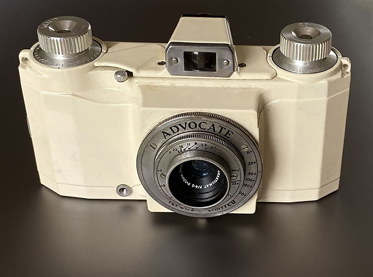 This beautiful and unusual camera was the first Kodak camera to be made entirely of plastic. It was assembled in Harrow from a bakelite body made by the well known radio manufacturer E. K. Cole (Ekco). Other components probably came from Rochester in the USA.  The Hawkette was never made for sale to the public, instead, according to RedBellows “given away under premium schemes for a number of products including magazines, cigarettes and Cadbury chocolates”. It was only available as such in the UK.