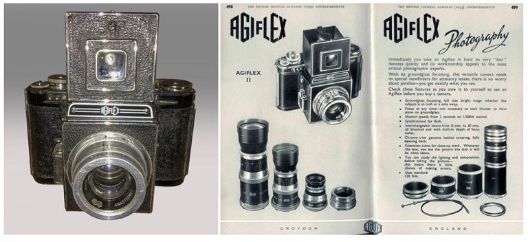 The Agiflex was an early British postwar 6×6 SLR, made by Agilux. It was derived from the British WWII military aerial camera ARL that was in turn derived from the German Reflex Korelle. The camera’s focal plane shutter has speeds from 1 sec. to 1/500 sec. and flash synchronization. The finder is a big waist level reflex finder, with hinged magnifier and eye level setting. It has a lens mount for interchangeable lenses.