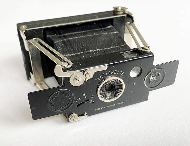 According to Red Bellows: “The Junior Box Ensign camera was sold by Houghton-Butcher as part of its range in the early 1930s. It is the first camera listed in an Ensign catalogue for 1932 and is described as a “reliable camera of simple design”, and was sold for a very modest price, which was about a third of the cost of the cheapest folding camera in the same catalogue (the Ensign Pocket “Twenty”). The 1932 catalogue also lists a portrait attachment, a case and a tripod attachment as available accessories.