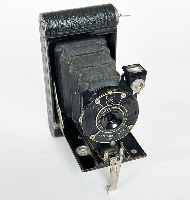 Most Kodak cameras were made in the USA, but some were made over here as well. This was a primitive folding bed camera for making 4×6.5cm exposures on 127 film. It was also marketed as Boy Scout Kodak and Girl Scout Kodak with new front plate designs by Walter Dorwin Teague. A coloured version was branded Kodak Petite. Its lens was a doublet in a rotary shutter, or a Kodak Periscopic lens in a Kodak shutter. The lens typically had four apertures, set by a thumb-wheel on the side of the shutter block, and numbered 1-4. The Model B had to be loaded through the front side, after removing the whole bed and bellows unit. It was produced from 1925 to 1934. It has the “autographic” feature, the slots for the autographic ‘pen’ are visible although the pen is missing.