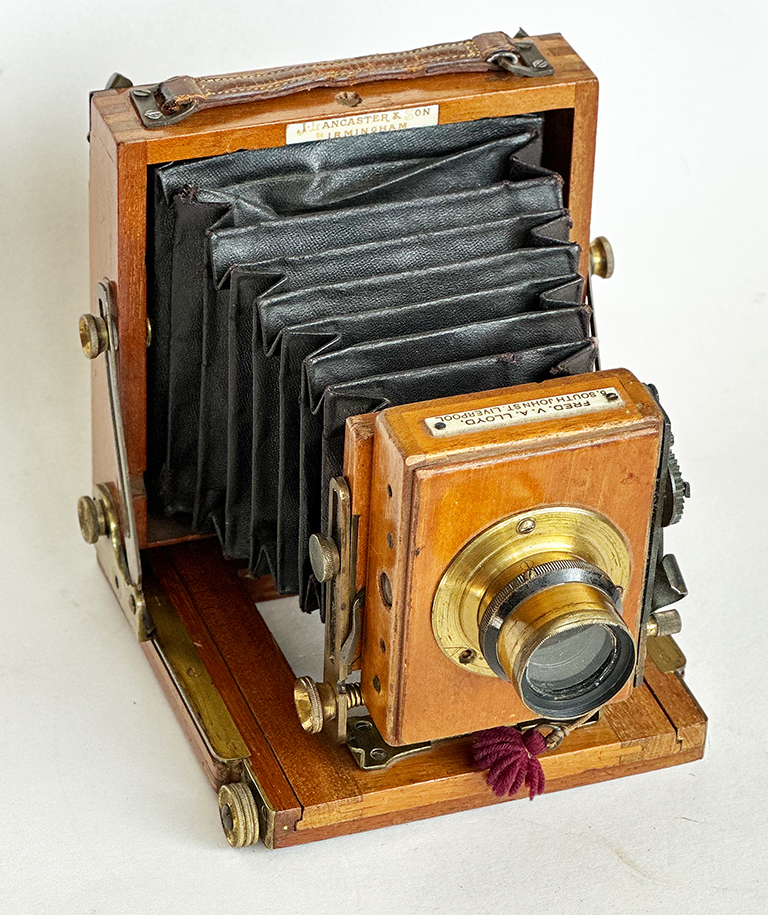 This camera belonged to the late father of my piano teacher (a Miss Dudley) when I was a child (c.1960) and she gave it to me to start my collection together with a collection of plates taken in old Heswall. My parents insisted I gave the plates back, so I don’t know what happened to them. It included a front mounted shutter, a lens, and a few plate holders. At the time this was made, J. Lancaster & Son of Birmingham, who at the time were the largest camera manufacturers in the world!