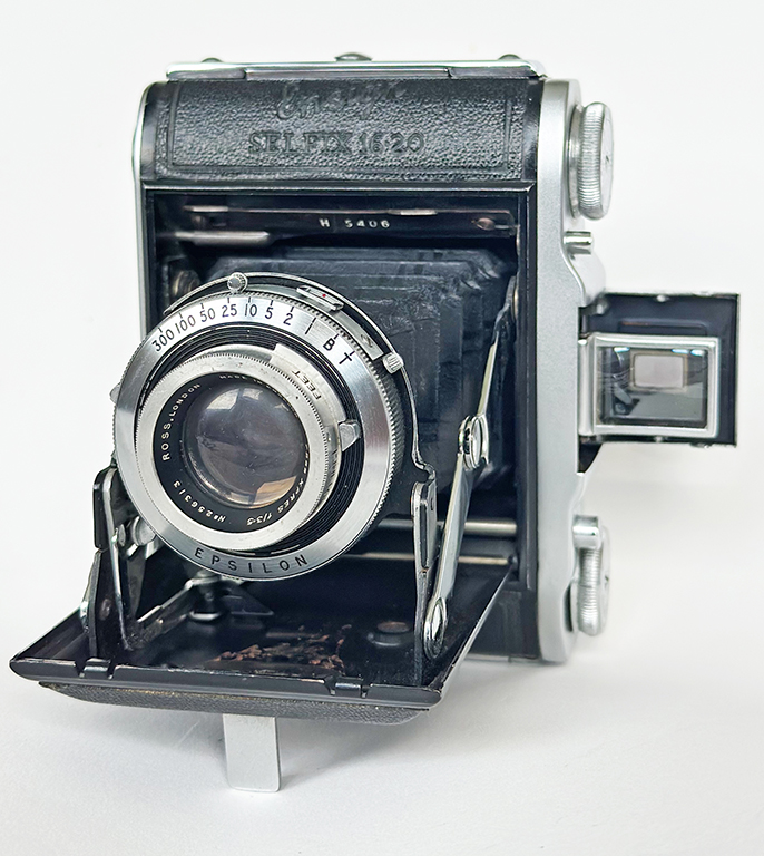 According to Camera-Wiki “The Ensign Selfix 16-20 is a folding camera made by Ensign. It uses 120 film or 620 film and can take sixteen 6×4.5cm frames per roll. There are two distinct body styles of the camera. The second body is easily distinguished from the first by the albada viewfinder and depth of focus scale on the other side of the top plate from the winding knob. The second version also has double exposure prevention. Both versions have a 75mm f/3.5 Ross Xpres lens in an Epsilon shutter, and an additional tripod socket for landscape format on the front with a screw cover insert. The Albada version has a curious shutter release button, containing a sharp spike, which pricks the finger if the button is pressed without first setting the shutter!”