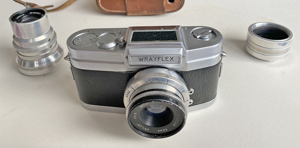 This unusual camera was a British effort to make a 35mm SLR. To save money (although it was still expensive) they used 2 mirrors instead of a pentaprism, so the image is reversed and not very bright. It has a full complement of speeds from ½sec to 1/1000th sec in the focal plane shutter. The Wray lenses had an excellent reputation. Wind-on was by a fold-out key in the centre of the bottom plate. This works surprisingly well, except when mounting on a tripod! Images are 24 x 32mm which gives the same ratio as standard 1/4 or 1/2 plate photographic paper and 40 images per film. This was abandoned in model Ia, and model 2 has a normal pentaprism. Very rare,.