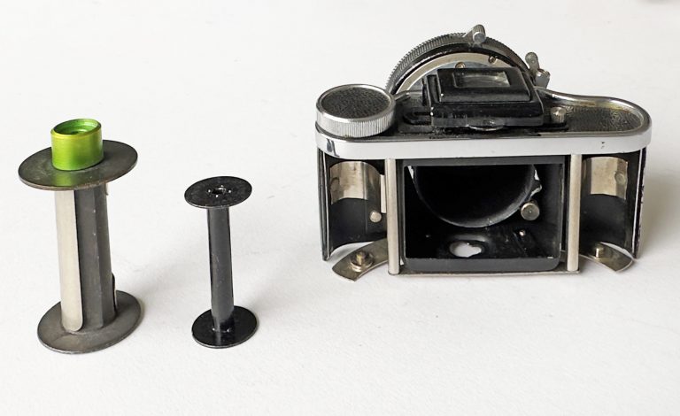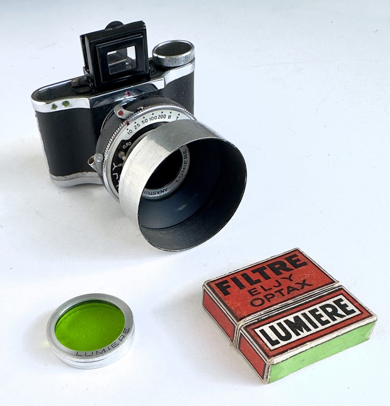 The original company started making cameras in the late 1920s until 1961 when they were taken over by the Swiss firm CIBA. Launched in 1937, The tiny Lumiere ELJY gets its name from the two locations of the Lumiere factories, Lyon and Joinville. In French the letters ‘L’ and ‘J’ are pronounced ‘EL’ and ‘JY’. The camera uses a purpose-made 24mm wide roll film, with a paper backing called ALTIPAN Eljy. The camera takes eight images 23mm x 35mm, very close to the 24 x 36mm of 35mm film but less the sprockets it is narrower. Made until the war, production continued in 1945. The various models all had the flip-up viewfinder, replaced in 1951 by the ELJY CLUB which had a more up-to-date viewfinder and also a simple extinction exposure meter,