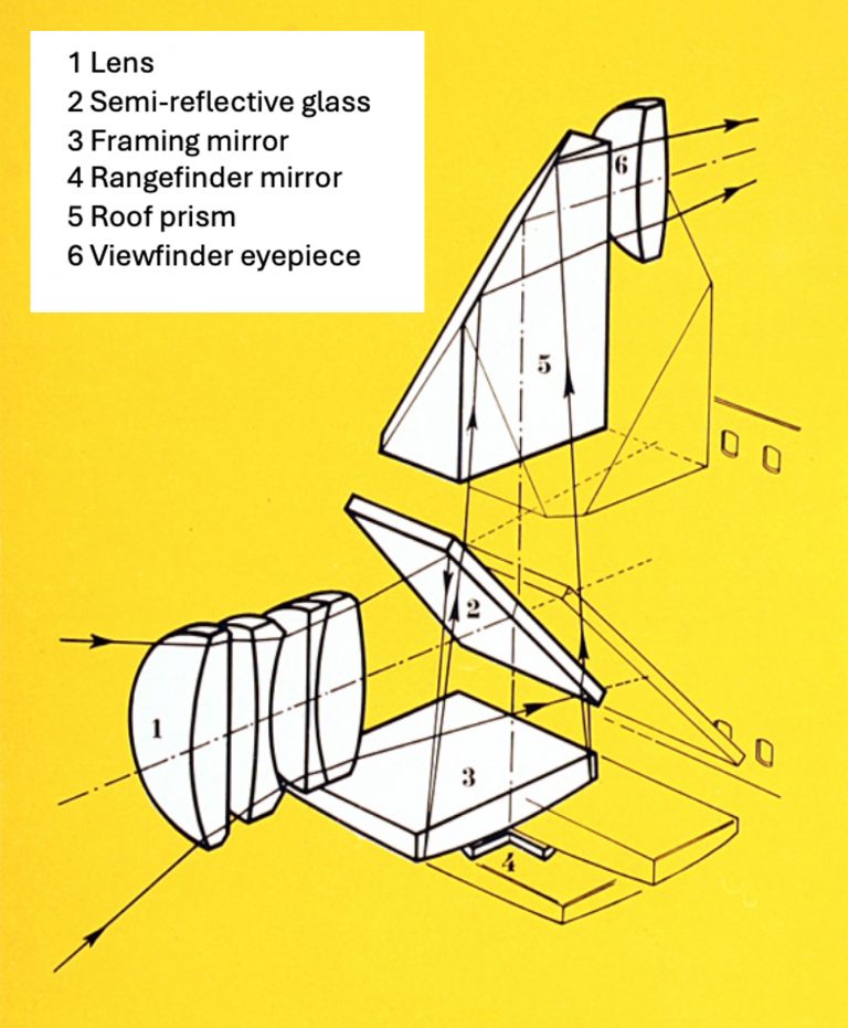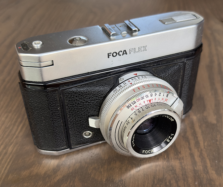 “In 1959, Foca, the company more famous for 35mm coupled rangefinder cameras, introduced the Focaflex, which used a peculiar light path into the reflex design. As the film was advanced, a reflex mirror swung up, not down in the usual way. Behind it a capping plate shielded the film from light entering the lens as the aperture iris and shutter blades opened to their widest settings for focusing. The mirror was semi-silvered to allow light to be both reflected from it and transmitted through it. Light entered the lens, hit the mirror and was reflected down to a silvered focusing screen in the base of the body. From there the image was reflected up again through the semi-silvered mirror to a small prism arrangement that turned it the right way up and right way round before reflecting it back out of the viewfinder. As the shutter was released, the aperture closed to its pre-set f-stop, the shutter blades closed and the reflex mirror plus the film-shielding capping plate swung away so that light could reach the film as the shutter opened and closed. At the same time, a blind closed over the viewfinder to prevent stray light from entering the body”.